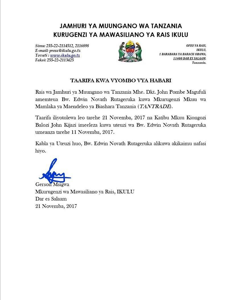 Rais wa Jamuhuri ya muungano wa Tanzania Mhe. Dkt John Pombe Magufuli amemteua Bw. Edwin Novath Rutageruka kuwa Mkurugenzi wa TANTRADE.
